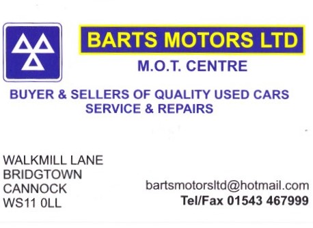 The 9th member of our 100 Club is Barts Motors Limited, Walkmill Lane, Bridgtown. WS11 0LL