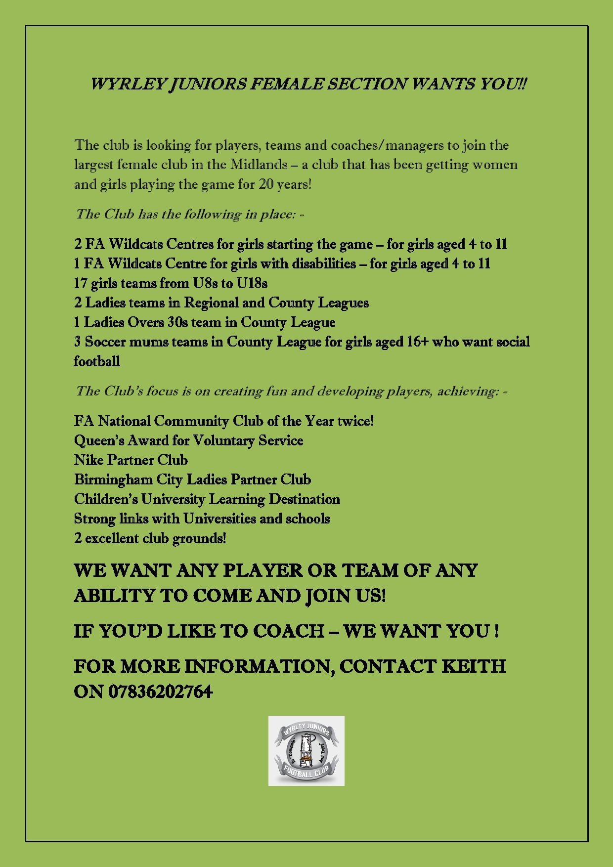 The club is seeking keen individuals to take forward groups of players looking for enthusiastic managers. Full details on the flyer below – please share…...